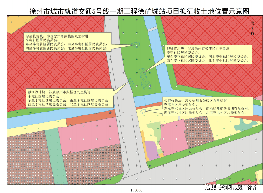 据公告显示,本次拟征收土地位于九里街道,共有4块地将被征收,将用于建设5号线一期工程徐矿城站,拟征收土地位置详见附图。